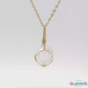This exquisite pendant features a raw, uncut Herkimer Diamond specimen showcasing natural crystalline structures. The organic, rough-cut gemstone is securely held by a minimalist 14kt gold filled yellow wire-wrap mounting. Its transparent to translucent clarity highlights the unique internal inclusions, creating a one-of-a-kind organic aesthetic. The polished yellow gold bail provides a sophisticated contrast to the rustic, unrefined beauty of the natural quartz, making it a perfect statement piece for nature-inspired jewelry collections.